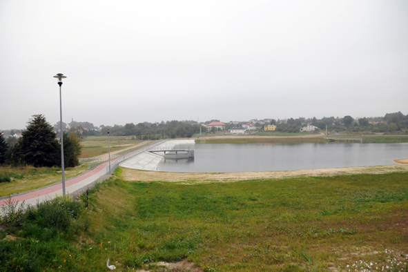 - Zagospodarowanie terenu wokół zbiornika. Teren przyległy do zbiornika wzdłuż promenady zostanie podwyższony. Pas pomiędzy zbiornikiem, a promenadą zostanie zagospodarowany poprzez obsianie mieszanką traw. Wzdłuż promenady zaprojektowano zieleń przez obsadzenie brzegu drzewami liściastymi i iglastymi, które stworzą naturalny charakter brzegu jeziora. Podwyższony teren w cofce zbiornika zostanie obsiany mieszanka traw z obsadzeniem drzewami liściastymi (olcha, brzoza, dąb). Na prawym brzegu zbiornika teren przy chodniku zostanie wyrównany nadmiarem ziemi z czaszy zbiornika i obsiany mieszanką traw.