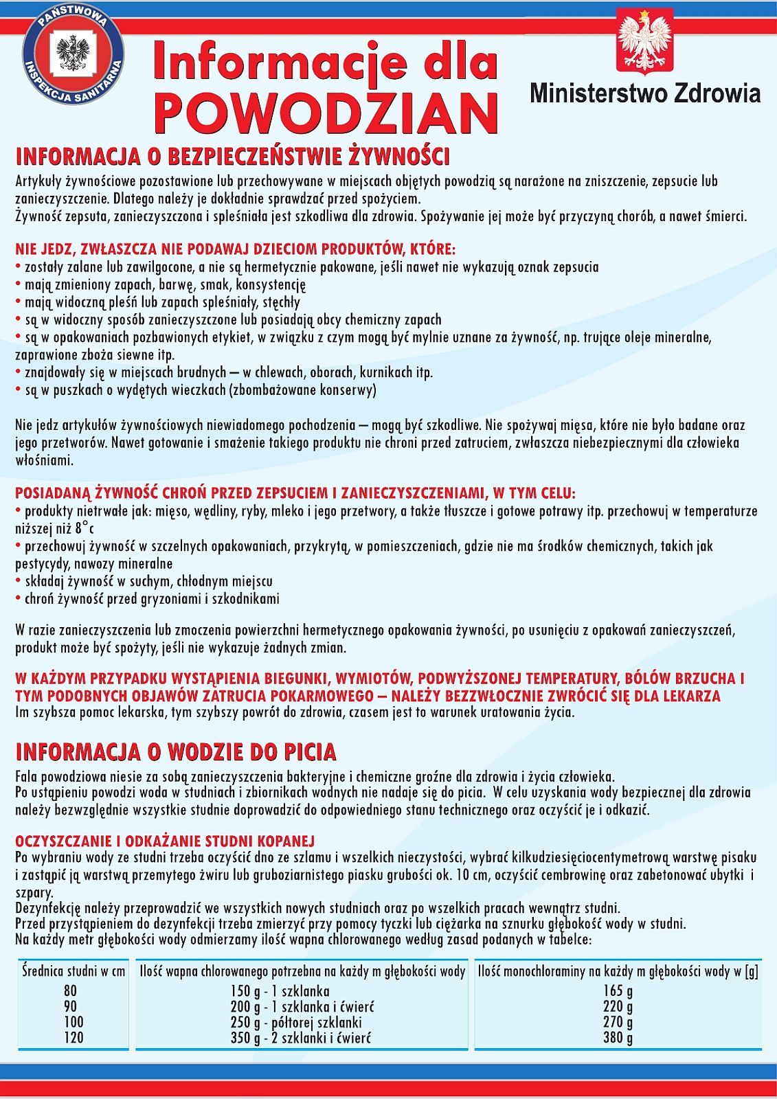 Informacja Państwowej Inspekcji Sanitarnej ws. bezpieczeństwa żywności, wody pitnej oraz o sposobach zapobiegania chorobom zakaźnym na terenach popowodziowych.