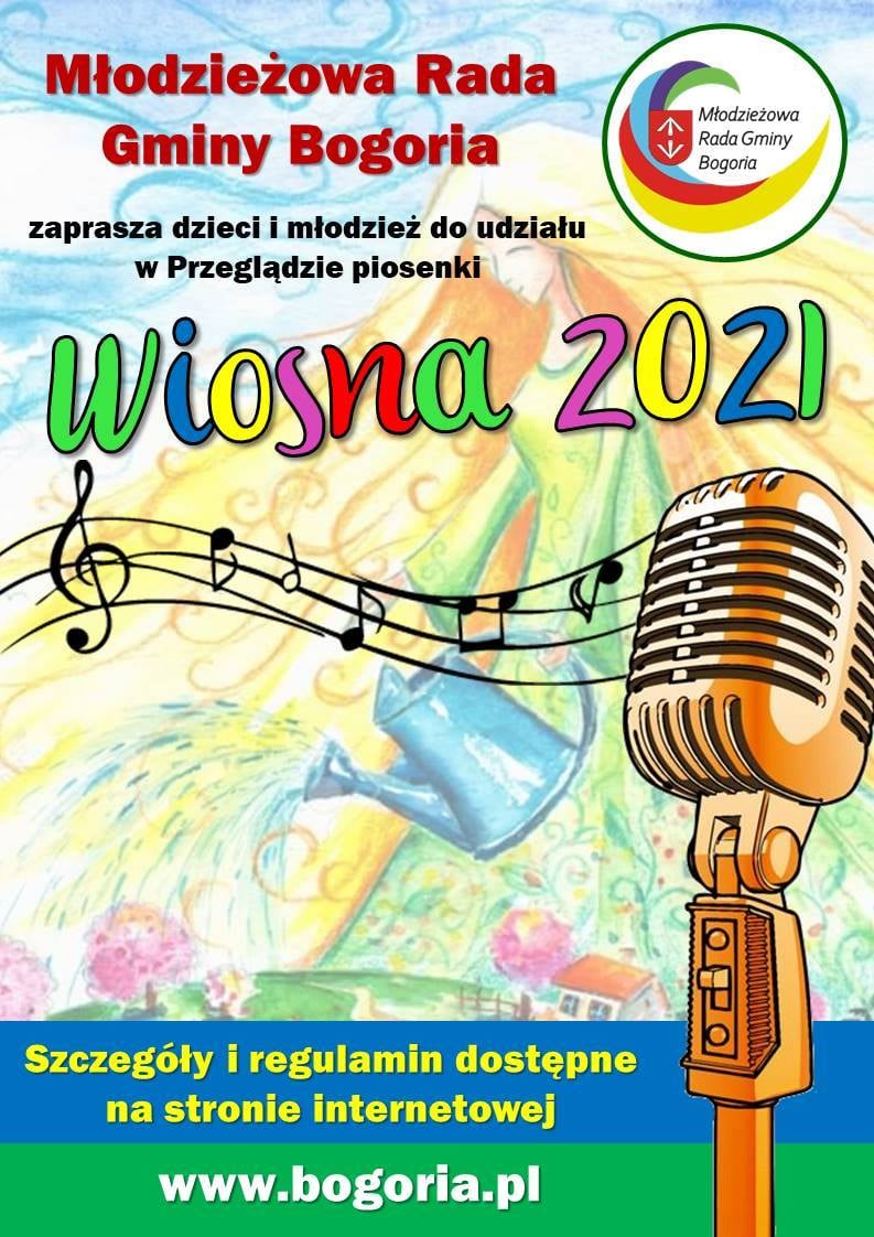 Młodzieżowa Rada Gminy Bogoria zaprasza dzieci oraz młodzież z terenu gminy do udziału w Przeglądzie Piosenki "Wiosna 2021". W związku z pandemią Covid-19 wydarzenie ma charaker ONLINE.