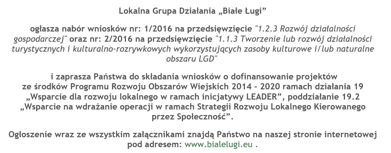 ogłasza nabór wniosków nr: 1/2016 na przedsięwzięcie "1.2.3 Rozwój działalności gospodarczej" oraz nr: 2/2016 na przedsięwzięcie "1.1.3 Tworzenie lub rozwój działalności turystycznych i kulturalno-rozrywkowych wykorzystujących zasoby kulturowe i/lub naturalne obszaru LGD"