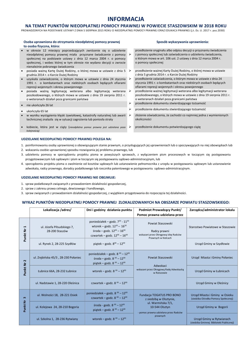 Informacja na temat punktów Nieodpłatnej Pomocy Prawnej na terenie powiatu staszowskiego w 2018 roku