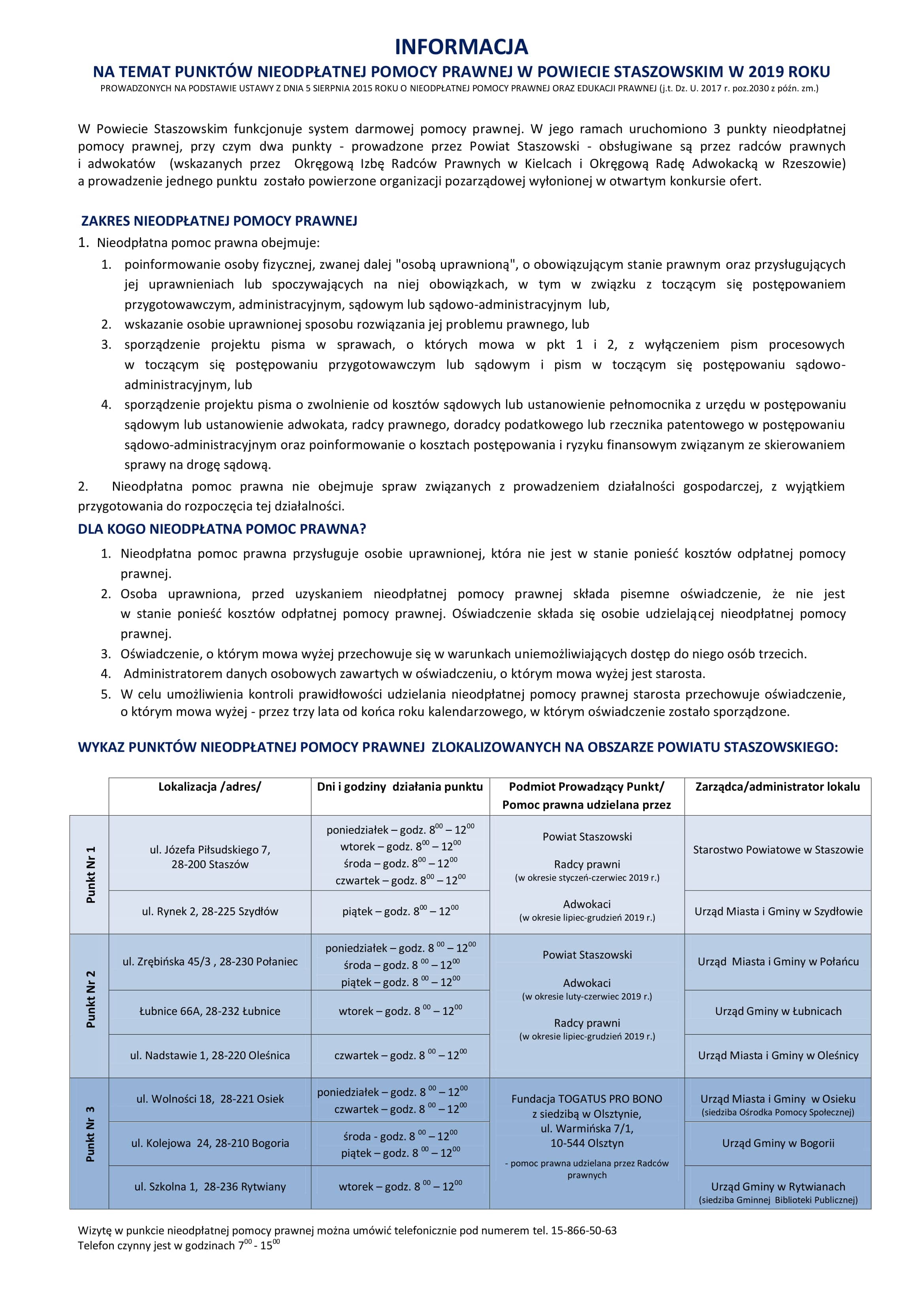 Informacja na temat punktów Nieodpłatnej Pomocy Prawnej na terenie powiatu staszowskiego w 2019 roku