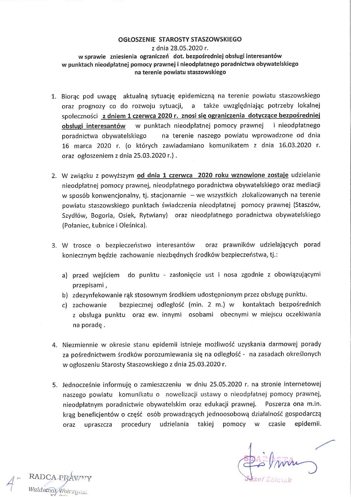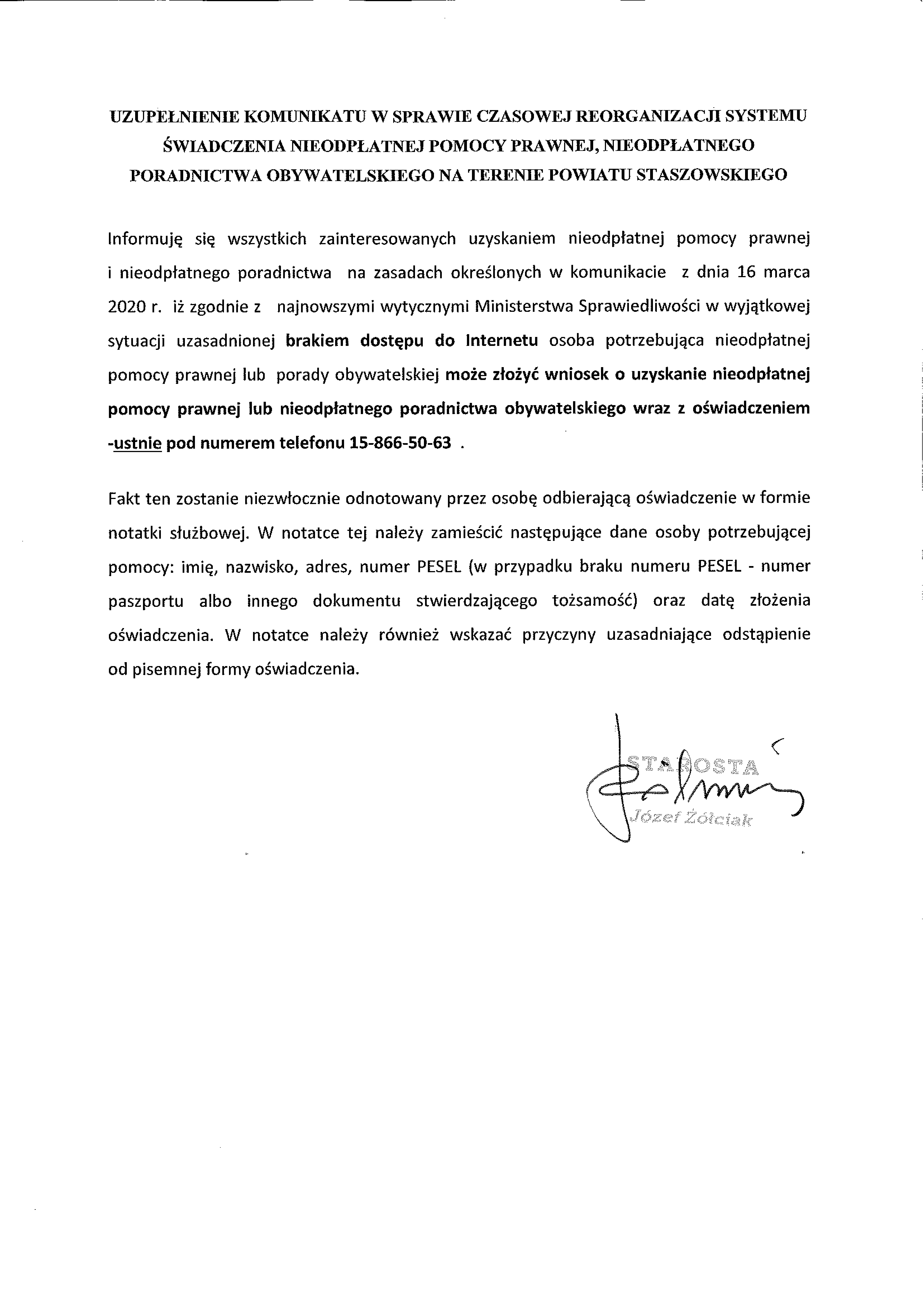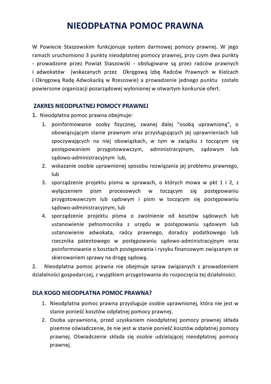 Komunikat Starosty Staszowskiego na temat świadczenia usług nieodpłatnej pomocy prawnej