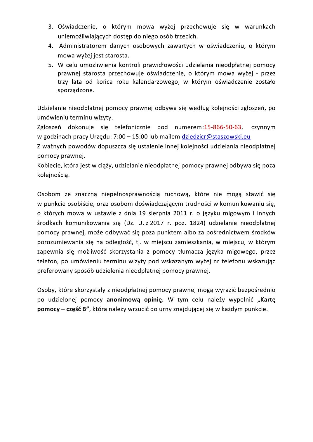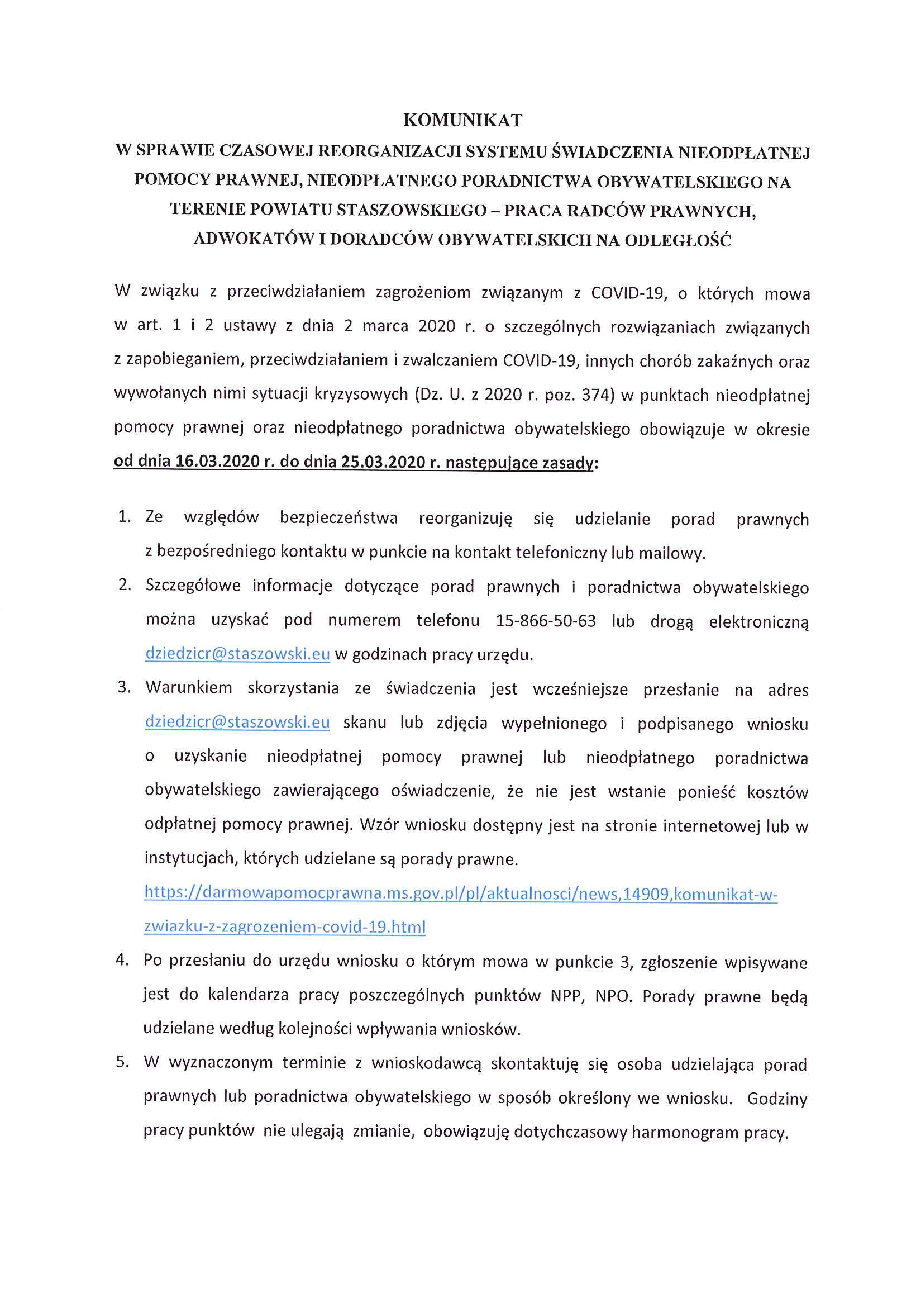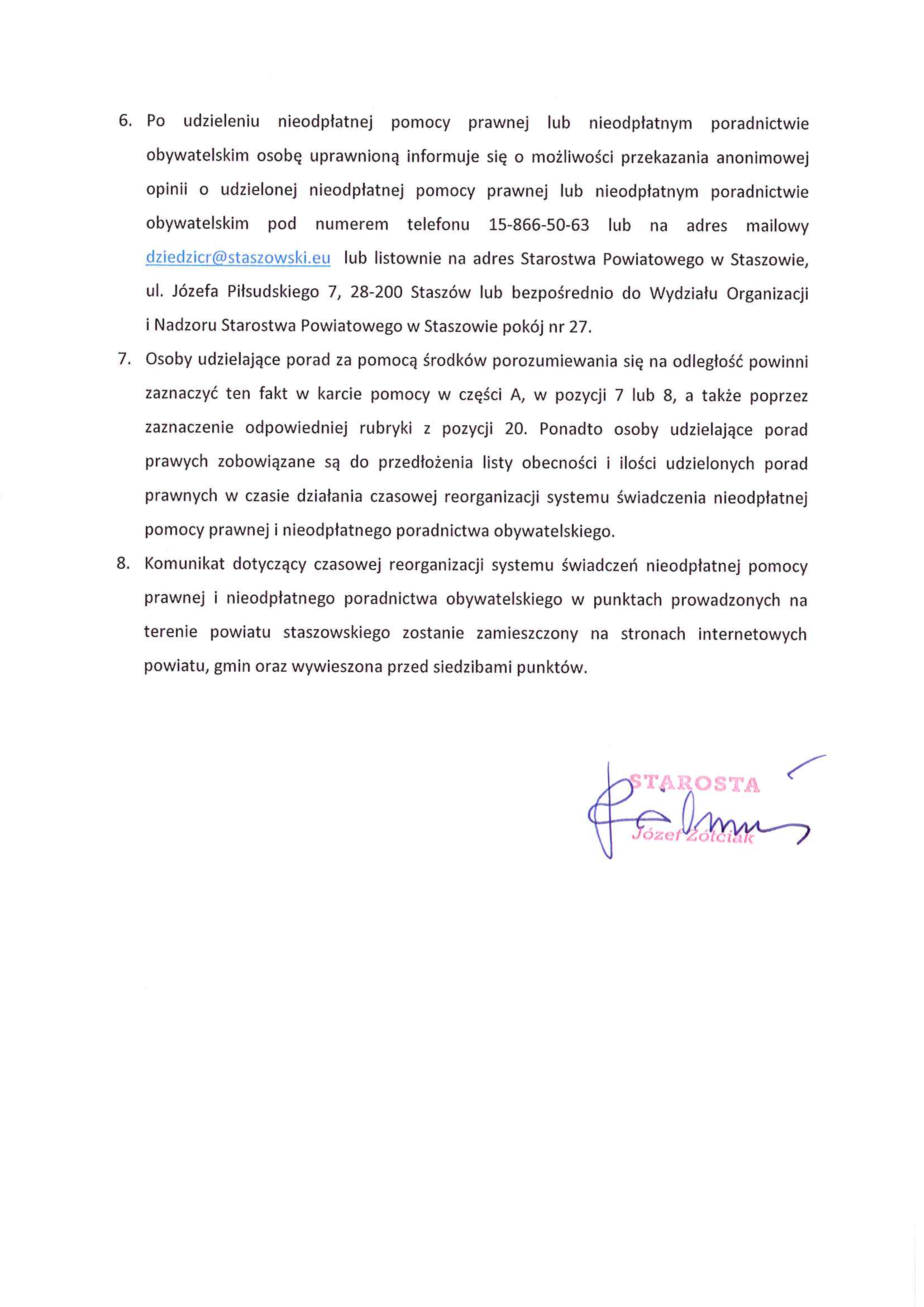 Komunikat Starosty Staszowskiego na temat świadczenia usług nieodpłatnej pomocy prawnej