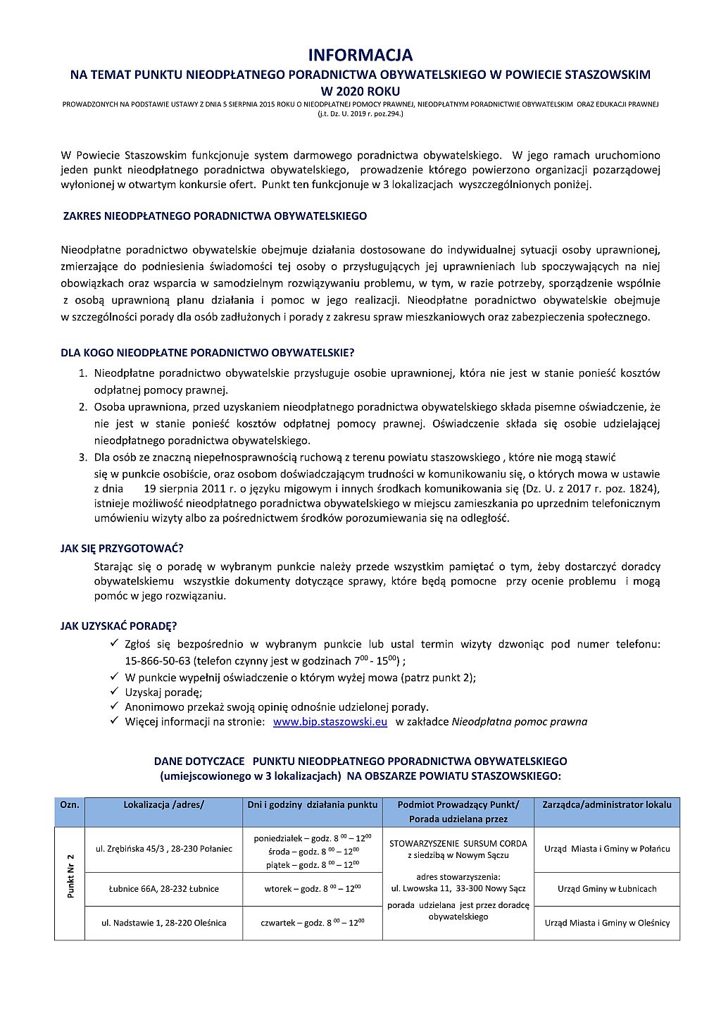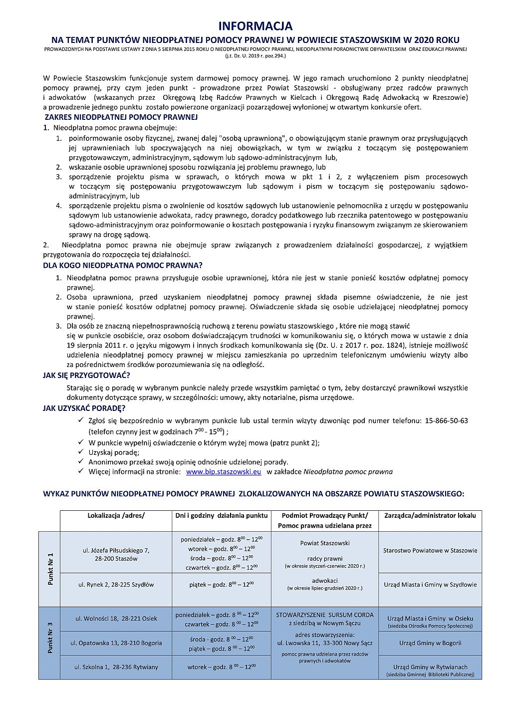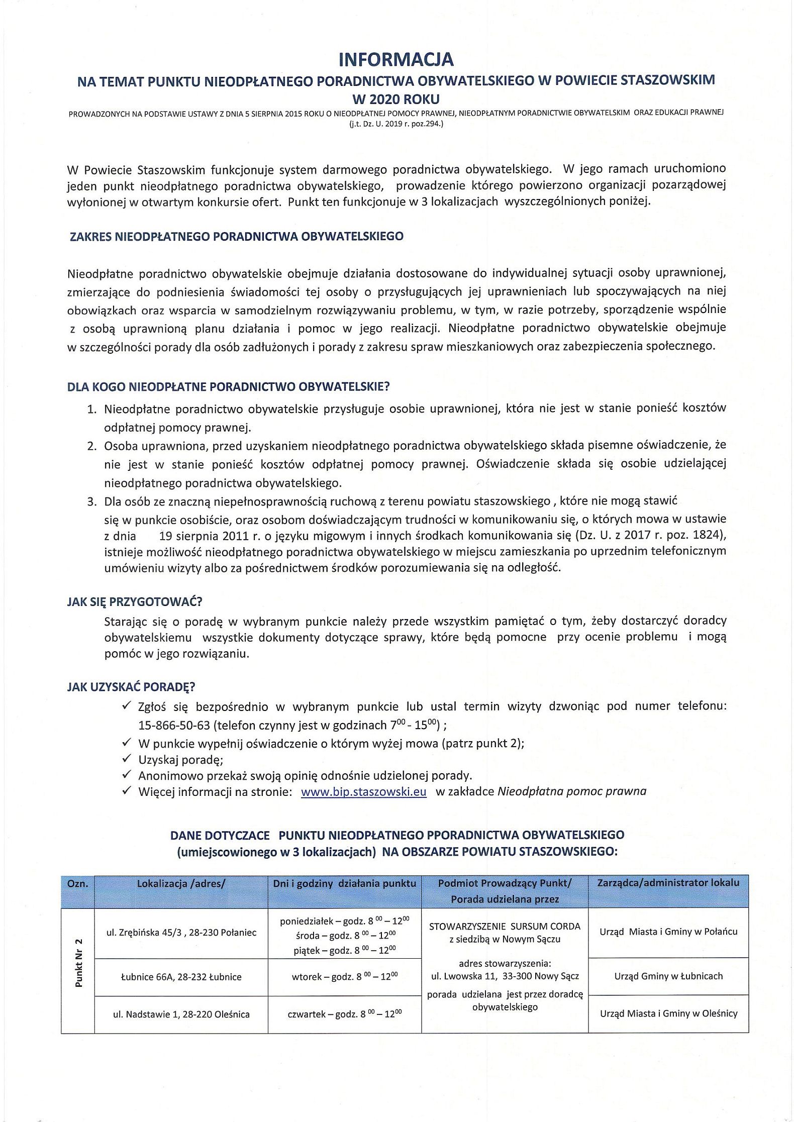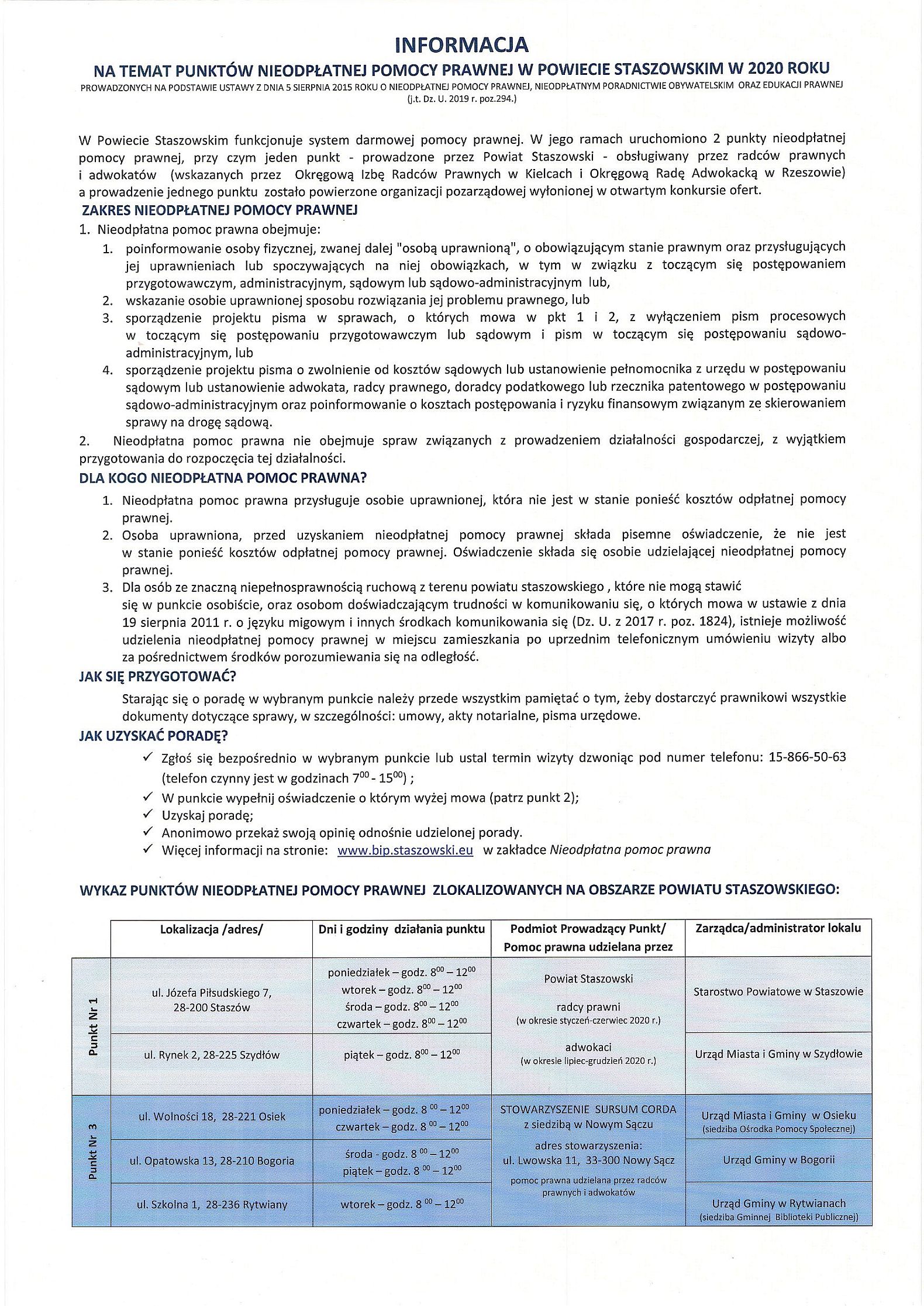 Wykaz punktów nieodpłatnej pomocy prawnej oraz informacja nt. punktów nieodpłatnego poradnictwa obywatelskiego na terenie powiatu Staszowskiego w 2020 r.