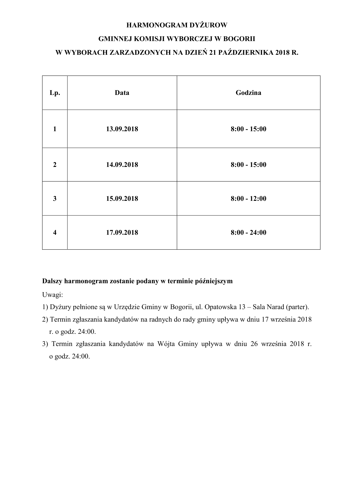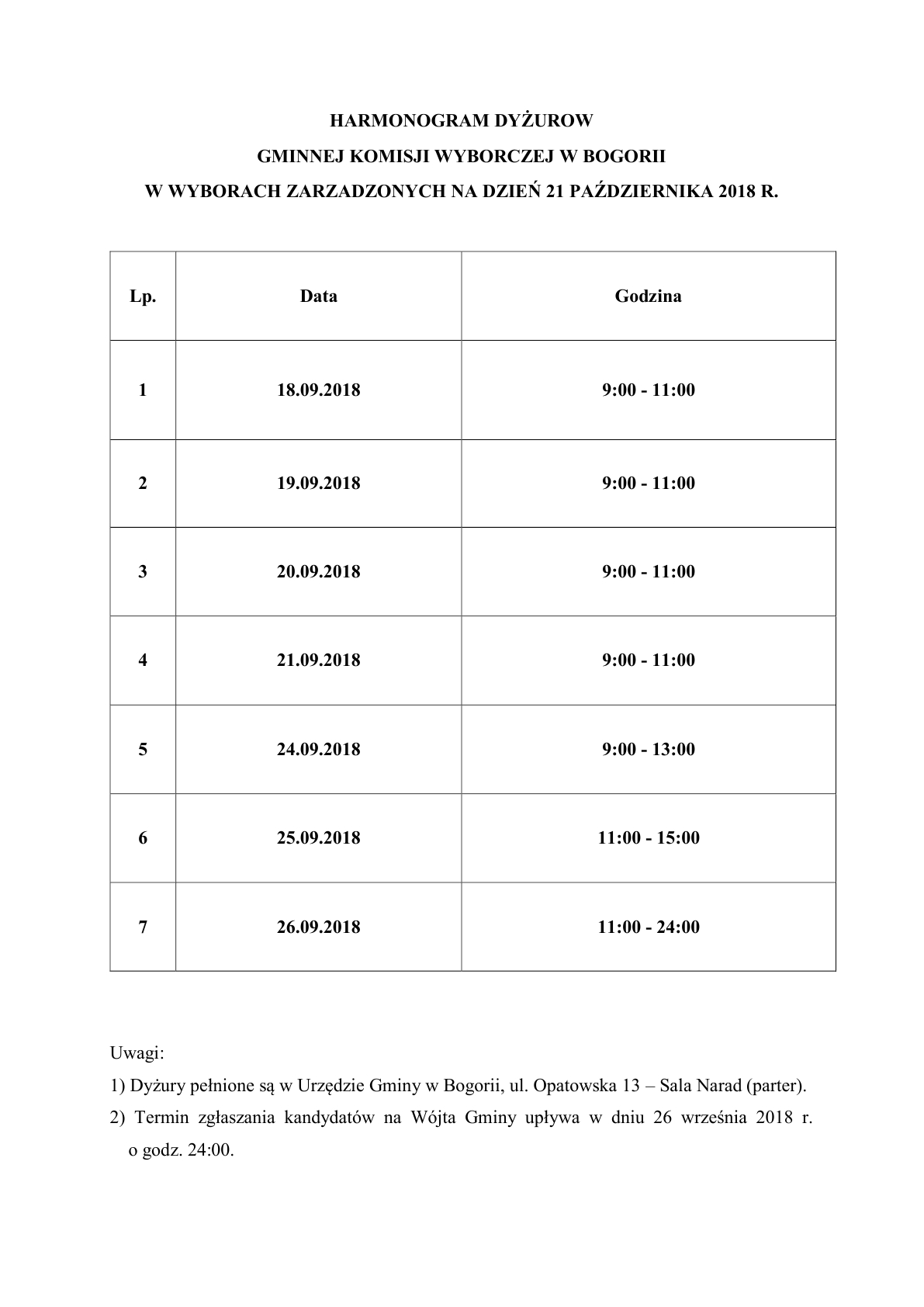 Harmonogram dyżurów Gminnej Komisji Wyborczej w Bogorii - Wybory Samorządowe 2018