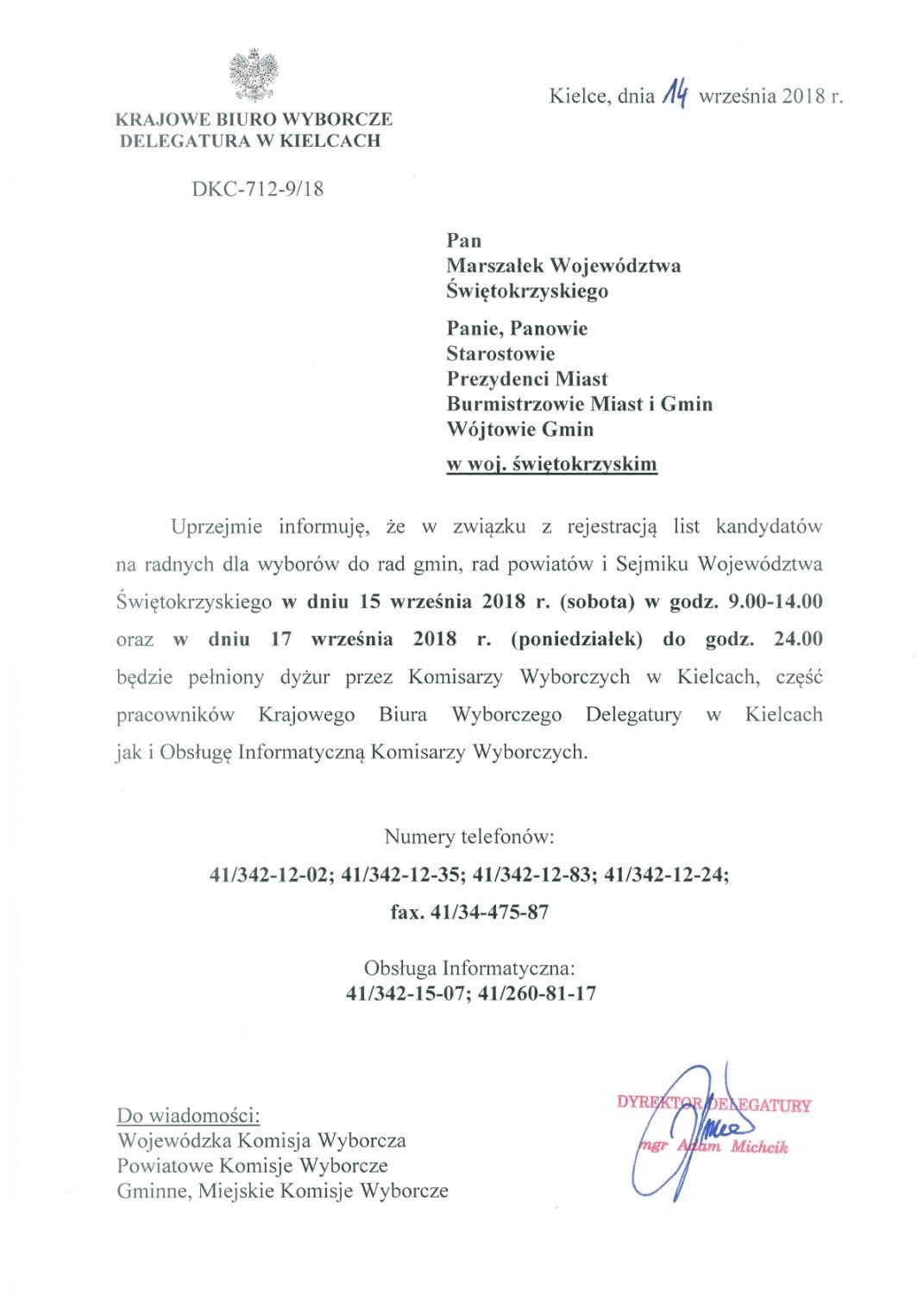 Harmonogram dyżurów KBW Kielce - 15-17.09.2018 r. - Wybory 2018
