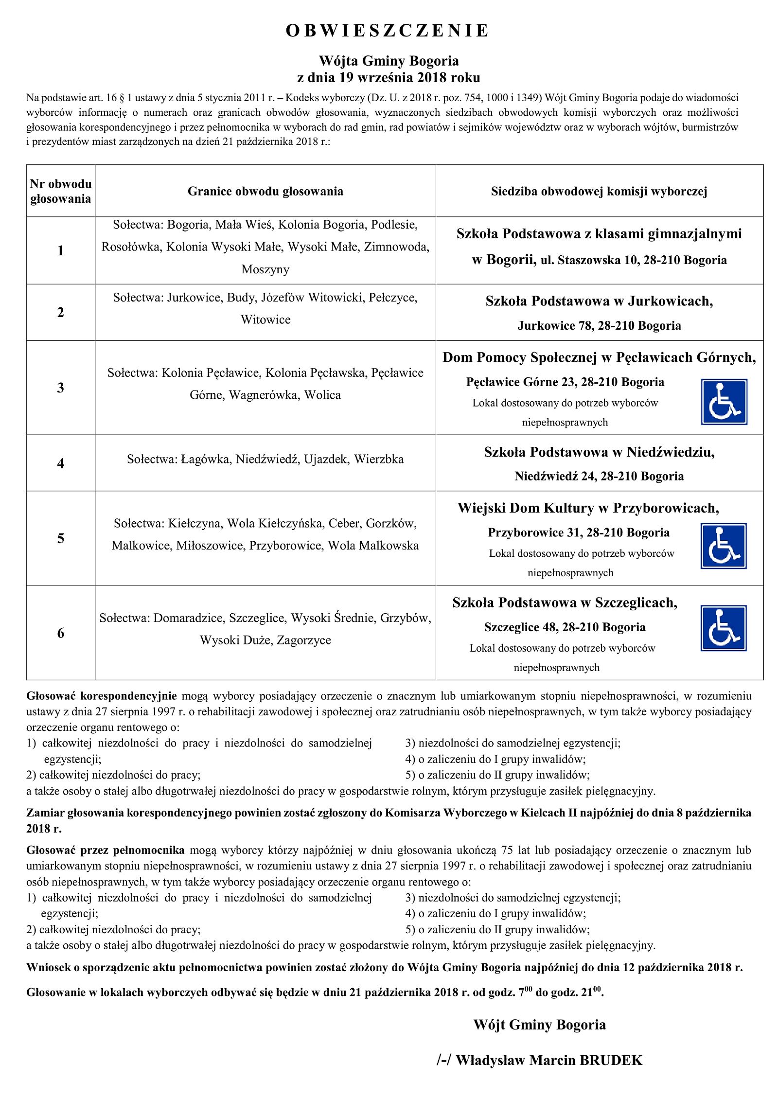 Obwieszczenie Wójta Gminy Bogoria z dnia 19.09.2018 r. o obwodach głosowania - Wybory 2018