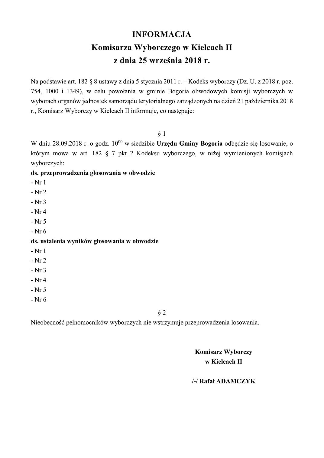Informacja Komisarz Wyborczego w Kielcach - Losowanie składów OKW - Wybory 2018