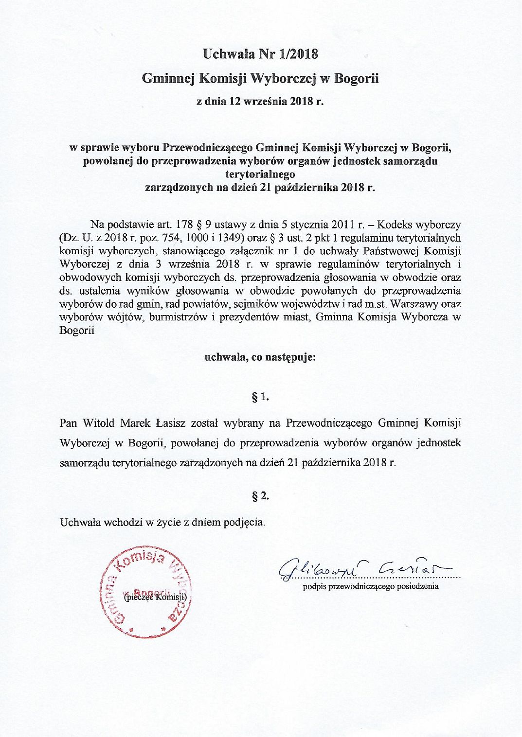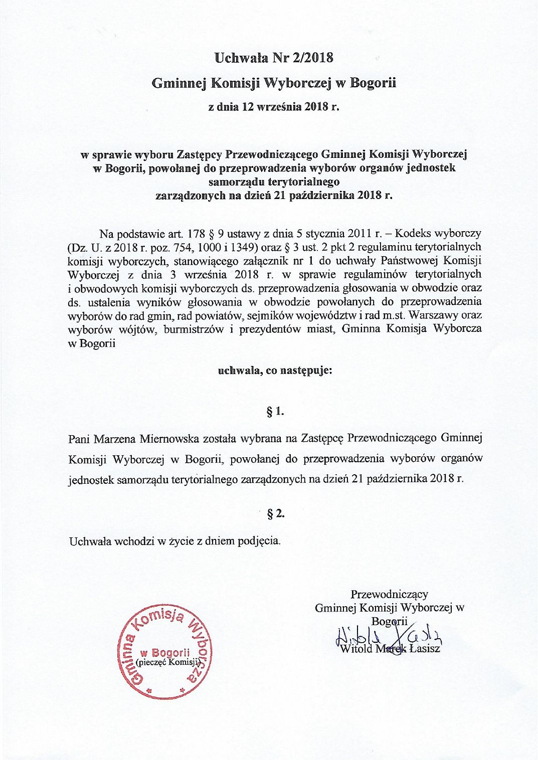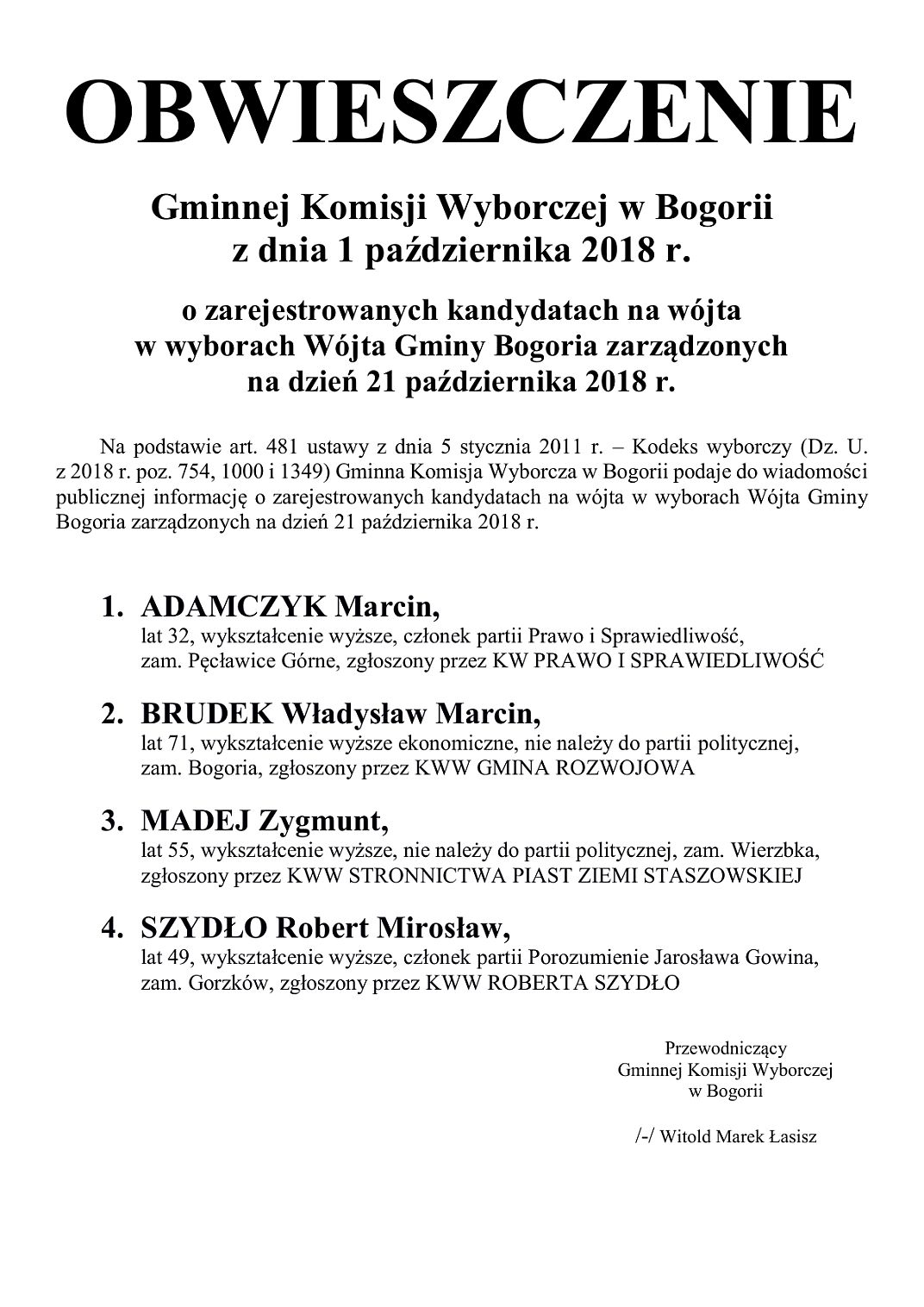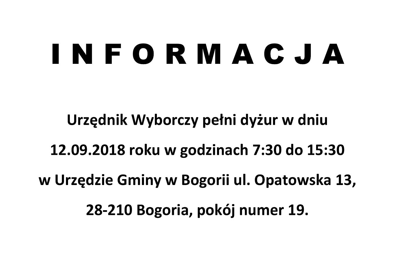 Informacja Gminnej Komisji Wyborczej w Bogorii - Wybory 2018